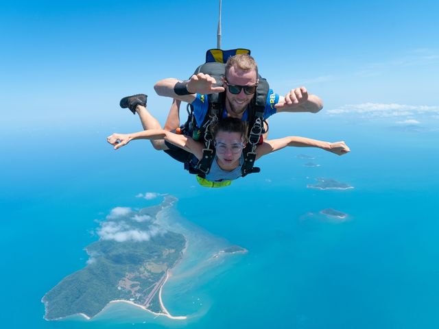 ケアンズの約140km南にあるミッションビーチでスカイダイビング。ケアンズからの無料送迎付き。14kmにおよぶプリスティンホワイトビーチにランディングするのはこのツアーだけ。1分感のフリーフォールと時速200kmを体験しよう。