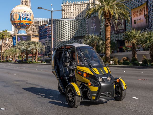 ラスベガスの魅力を満喫するゴーカーストリップツアー!小型の電動ゴーカーをレンタルして、ラスベガスサインやリゾートワールド、チャペルロウなどを通るツアールートを自分たちのペースで巡ります。自由に停車し、写真を撮りながら特別な体験をお楽しみください。