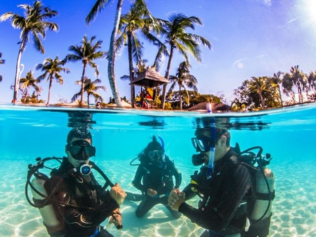 シャングリラホテル前の海洋保護区での体験ダイビングを楽しみませんか?ホテル敷地内のショップから出発なので移動も楽ちん。1ダイブなら半日でサクッと参加できます。日本語インストラクターも一緒に潜るので初心者さんでも安心です。