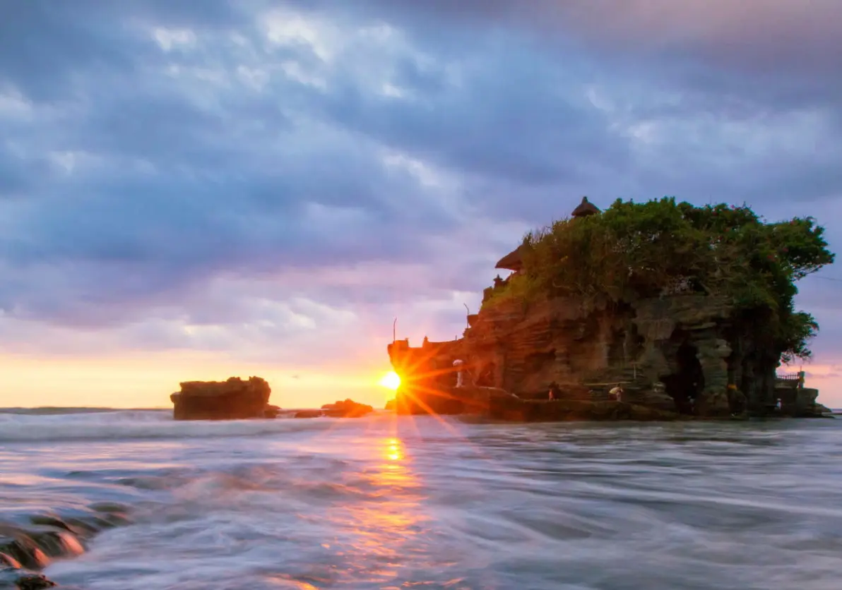 インド洋に沈む夕陽をバックに浮かび上がるタナロット寺院のシルエットはとても神秘的。