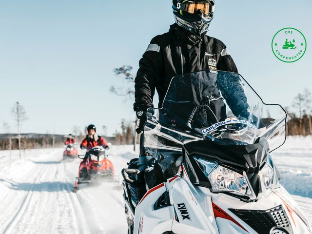 ラップランド最大級の冬のリゾート地レヴィでスノーモービルを体験!白銀の世界が広がる大自然の中をスリリングに駆け抜けます。経験豊富なガイドが乗り方から安全のルールまでしっかりレクチャーしますので、初めての方でも安心してご参加ください。途中休憩では心温まるホットベリージュースもご用意しています。