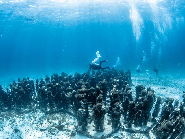 話題の水中美術館をベテラン日本人ガイドと探検!サンゴの発育を促す為に沈められた400体もの彫刻の数々を巡ります。海底に広がる不思議な光景をその目でお確かめください。2本目はサンゴ礁ポイントへご案内。1グループ貸切のプライベートでご案内するので初心者の方も安心です。