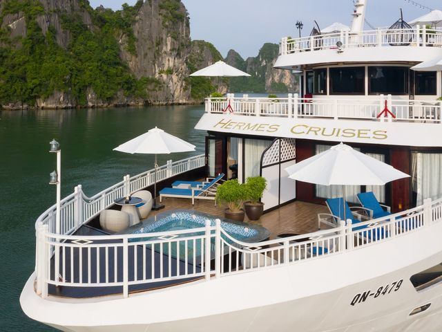 全室バルコニー付きの豪華客船「エルメス号」で行く、世界遺産ハロン湾1泊2日クルーズ。全18室とスモールサイズですので、より静かなプライベート空間をお過ごしいただけます。2つの屋外プールが付いた、新しいラグジュアリー船で、世界遺産にも登録されたハロン湾の幻想的な景観をたっぷりご堪能ください。船内での滞在やお食事はもちろん、 ティートップ島上陸やスンソット洞窟探索などのハロン湾観光もお楽しみいただけます。