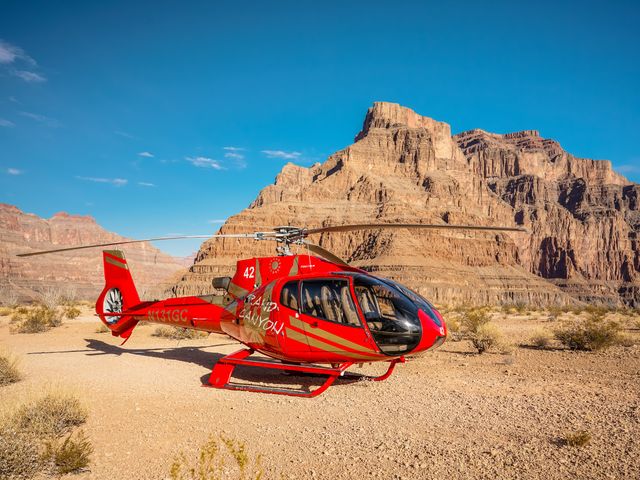フーバーダムやモハーベ砂漠を眼下に、雄大な景色の中をヘリで優雅に飛行。絶景を楽しみながら約975メートルの高度を降下し、谷底へと着陸します。軽食&シャンパンや周辺散策を満喫し、空と大地の両方からグランドキャニオン・ウエストの魅力をご堪能ください。