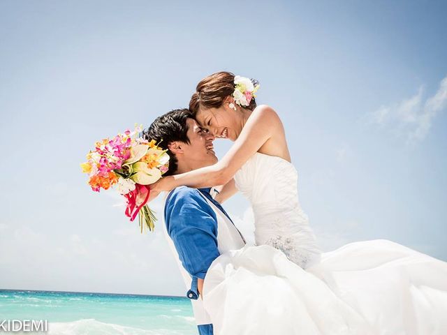 カンクンの青い空、青い海をバックに記念撮影。日本人フォトグラファーAki Demiが監修したメキシコ人カメラマンによるフォトサービスで、おふたりの魅力を引き出します。暑さを避けるため、朝早い時間からのスタートです!
