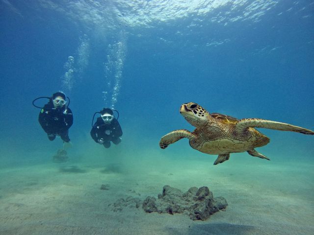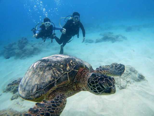 ワイキキより車で10分の場所にあるケワロ港より出航し、ウミガメの遭遇率が高いダイビングポイントへ!ウミガメやたくさんの魚の群れを見ることができます。日本語インストラクターが同行するので初心者でも安心してご参加いただけます。