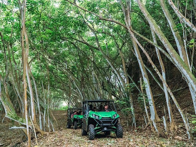ガイドが運転する四輪バギーに乗車して、オフロードを進行!コウラウ山脈麓、カネオヘ湾やノースショアも望め、海と山に囲まれた自然を肌で感じよう。