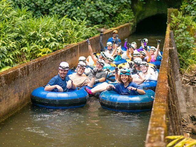 サトウキビ農園の日系移民などが手作業で掘った森の中の用水路を、浮き輪(チューブ)に乗って息を呑むほど美しい風景を眺めながら下るマウンテン・チュービング・アドベンチャー!知識豊富なガイドがあなたをきちんとアシストするから安心です♪友達や家族みんなで楽しめる新感覚アドベンチャーツアー!