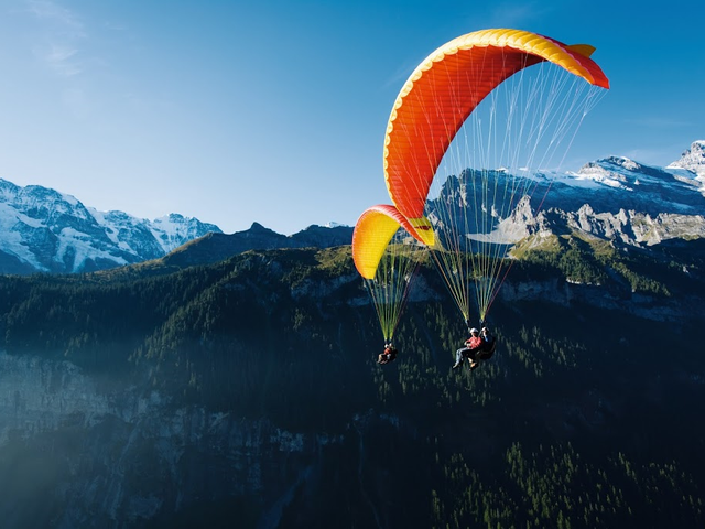 インターラーケンの美しい絶景を上空から眺められるパラグライダー!経験豊富でフレンドリーなパイロットと一緒飛ぶので、初めての方でも安心してご参加いただけます。鳥になった気分で自由に空を飛んで気分爽快!