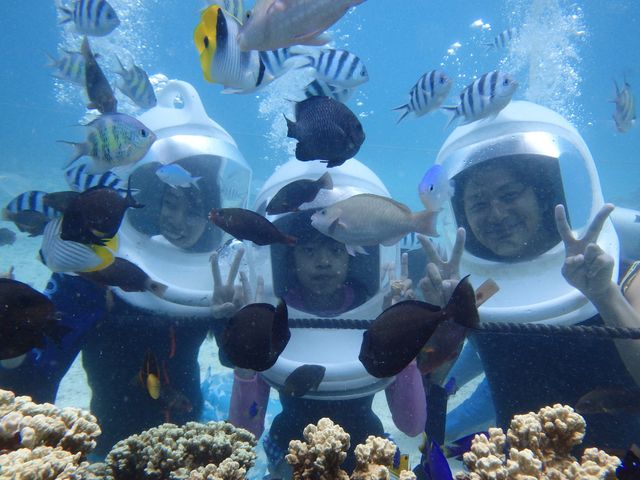 海中でも呼吸ができるヘルメットをかぶって、気軽に海底散歩を楽しめるアクアウォーク!顔が濡れないので眼鏡やメイクもそのままで大丈夫。インストラクターは日本語でご案内、安心してご参加いただけます。色鮮やかなお魚が泳ぐ海の世界をお散歩しましょう♪シュノーケルセットも貸出あり。パラセーリングやイルカウォッチングも付いた充実プランもございます。