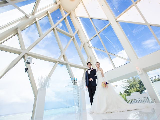 青と白のコントラストが美しく光るチャペル「ブルーアステール」。ブルーアステール前の美しいビーチへご案内するフォトプラン。一生に1度、一番美しく幸せに満ちた二人の姿を、是非写真に収めませんか?