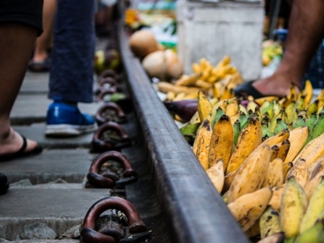 メークロン線路市場とワットパクナムを巡るツアーへご案内。メークロン線路市場では、線路の上にせり出した市場の様子を市場と列車からお楽しみいただきます。ワットパクナムでは息を呑みほど美しい、幻想的な天井画をご堪能ください。