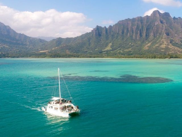 カタマランボート(双胴船)に乗って、穏やかなカネオヘ湾を45分、古代養魚池(フィッシュポンド)をボートで20分で巡るクルーズツアーです。美しく輝く海と、海から望むコオラウ山脈のコントラスト、沖合に浮かぶチャイナマンズハット、ホクレアビーチなどをご堪能いただけます。運が良ければ海ガメの餌付けが見られるかも⁈
