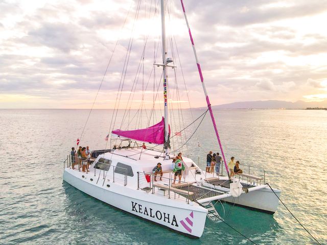 プリンスワイキキ前、アクセス良好の港からカタマラン船に乗り出航。約2時間のセーリングをお楽しみください。ハワイの夕焼けに染まる海と空の眺めは日常とは違った特別な景色。沖合では船を降りてスイミングを楽しむことも可能です。ご予約はこちら。