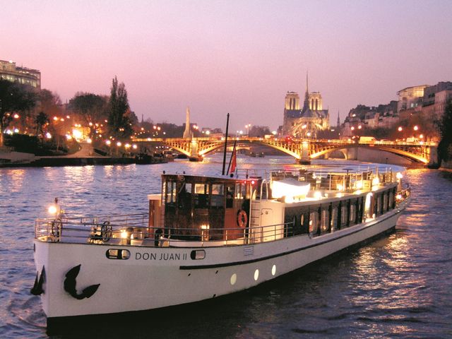 セーヌ河を進む最高級クルーズ船「ヨット・ド・パリ」。気品溢れる船内は全てのテーブルが窓側のプライベートシート。セーヌ川のクルーズ船として史上初めて有名グルメガイドで★を獲得したディナーと厳選されたワインをお楽しみください。往復メルセデスベンツでの送迎もハネムーンや記念旅行の特別な気分を盛り上げてくれます。