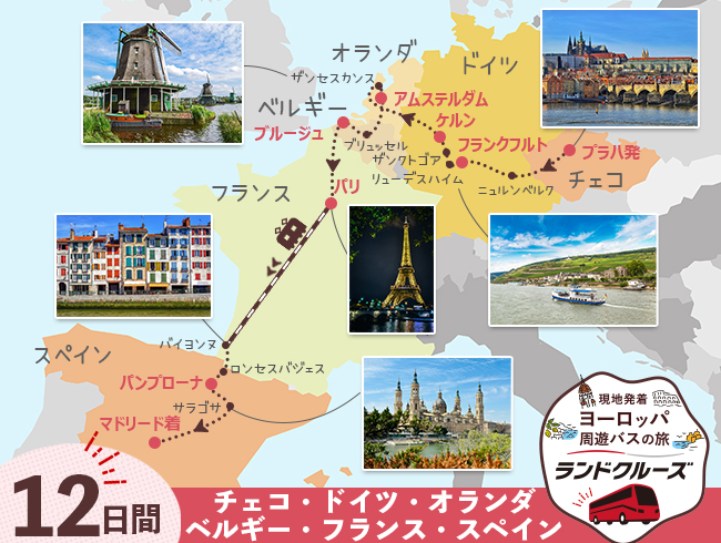 ヨーロッパ周遊ランドクルーズ!プラハ、フランクフルト、ケルン/ケルン大聖堂、アムステルダム、ブリュッセル/グランプラス、ブルージュ/マルクト広場、パリ/エッフェル塔・凱旋門、バイヨンヌ、パンプローナ、サラゴサ、マドリードなどを訪問。1名様から催行、充実した周遊の旅をお楽しみください!