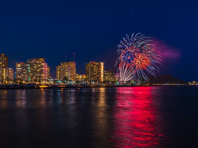 ザ・ホニ・オラニ号の金曜日限定のクルーズ!静かな海にゆっくりと沈む夕陽を見た後は、夜空に浮かぶ大輪の花火を鑑賞します。ロマンチックで心に残るハワイの夜を過ごしたい方はぜひどうぞ。ご予約はこちら。