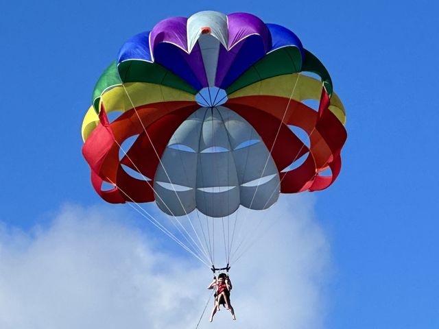 グアムを空から一望できる人気のパラセーリングとマリンスポーツがセットとなったお得なプラン!イルカウォッチングまたはアクアウォークから選択可能、空と海のアクティビティどちらもお楽しみいただけます。経験豊富なインストラクターがご案内、パラセールボートはトイレ付きで安心です♪
