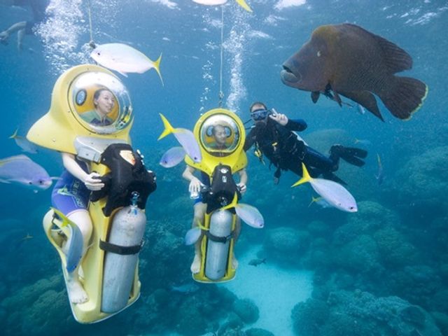アウターリーフのポンツーン(人工浮き島)から水中バイクに乗って気軽に海中散歩を楽しみませんか?ボタンを押すだけでどなたでも簡単に操作出来る、世界でもまだ珍しいアクティビティです!ご予約はこちら!
