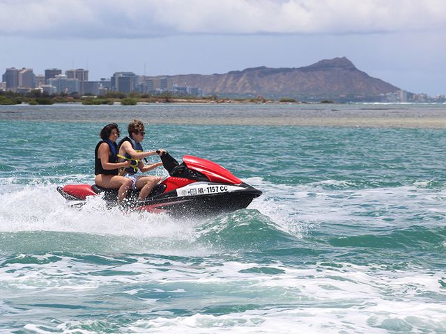 オアフ島で最高のウォータースポーツをお探しなら、ケエヒ・ラグーンでの楽しいジェットスキー・ツアーはいかがでしょう。インストラクターの指導付き、30分間の爽快なライドは迫力満点!ワイキキのホテルやリゾートから数分のところにあり、アクセスもばっちり。4ストロークエンジンの自由で力強いパワーを感じながら、ハワイの海を疾走しましょう!