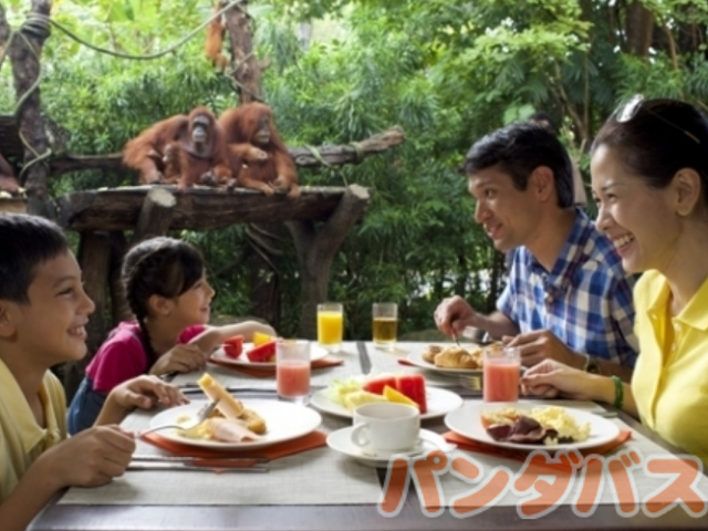 シンガポール動物園ならではの体験!動物たちとの朝食を楽しめるプランが大人気。オランウータンなど様々な動物たちが、レストランのテラスに遊びに来てくれます。朝食会場までは日本語ガイドがご案内するので安心。ビュッフェ形式の食事を楽しんだ後は、動物園をたっぷり自由観光!ご自身でお好きな時間に帰ることができるので、小さなお子様連れにもおすすめです。