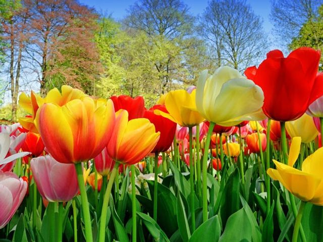 チューリップやヒヤシンスなどの花々が一面に咲き誇る、世界で最も美しい春の庭園キューケンホフ。色鮮やかに染まる広大な庭園をゆっくりと散策し、オランダの春を体感してください!園内にある風車を登るとチューリップ畑が一望できますよ。