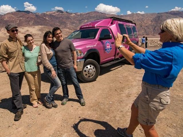 ピンクジープ車の快適バンで行く、デス・バレー国立公園観光。海抜マイナス86mのバッドウォーター、デス・バレーを一望できるダンテズ・ビューなど見逃せないスポットやデス・バレーマーケットプレイスへの立ち寄りも。選べるサンドウィッチの昼食付きです。