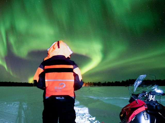 静かで美しい夜のラップランドへ!スノーモービルに乗って静寂の雪原を駆け抜けながら、オーロラを探す旅に出かけましょう。オーロラの出現を待つ間は、焚き火を囲んで温かい飲み物をいただきます。北極圏の闇夜に浮かび上がる光のシンフォニーをお見逃しなく。