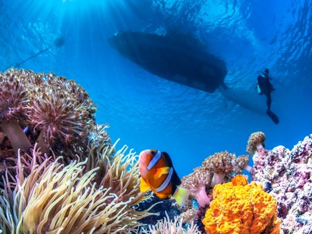 ハイスピードで進むクルーズ船に乗って、ウィットサンデー諸島近くのハーディーリーフまたはナックルリーフに位置するポンツーン(人工の浮き桟橋)リーフワールドへ。サンゴ礁のすぐ脇に建てられたリーフワールドではスノーケリングや半潜水艇クルーズ、オプションでダイビングやヘリコプター遊覧飛行が楽しめるほか、サンデッキ、更衣室、シャワー、海中展望台など設備も充実しています!