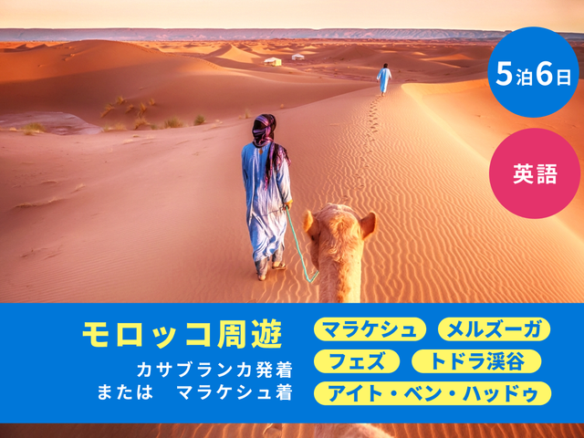 国際線が到着するカサブランカから、南北のモロッコ人気観光地を全て網羅する欲張りな5泊6日ツアー!マラケシュ、ワルザザード、メルズーガ、フェズと南回りで旅を進めます。メルズーガではラクダ乗り体験も!魅力たっぷりのモロッコを満喫しましょう。