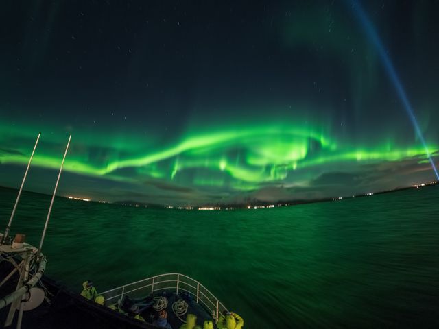 レイキャヴィークの港町から15分ほど海へ出ると、オーロラ鑑賞に絶好のロケーションにたどり着きます。星空の下、遠くに見える街の明かりを背景に見るオーロラは、忘れられない思い出になること間違いありません。