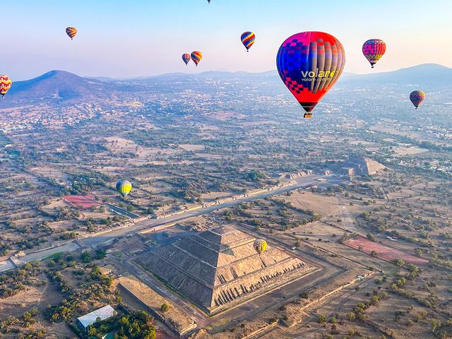 世界遺産 テオティワカン遺跡上空で気球から日の出を見る贅沢な体験をしてみませんか。優雅な遊覧飛行の後にテオティワカン遺跡およびグアダルーペ寺院でのガイド付の終日プランもご用意しています。