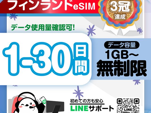 フィンランドで使える便利なプリペイドeSIMの販売です。ご購入後、スマホでの簡単なステップで設定を行い、現地でスムーズにネット利用が可能になります。設定サポートも充実しているので、初めてeSIMを利用する方も安心です。