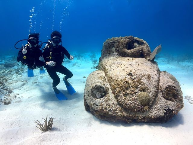 ライセンス不要!400体もの彫刻が海底に沈む、話題の水中美術館をベテラン日本人インストラクターがご案内。さらに2本目はお魚いっぱいのサンゴ礁ポイントを潜ります。記念に嬉しいダイビング写真のプレゼント付き♪貸切催行なのでリラックスしてご参加いただけます。