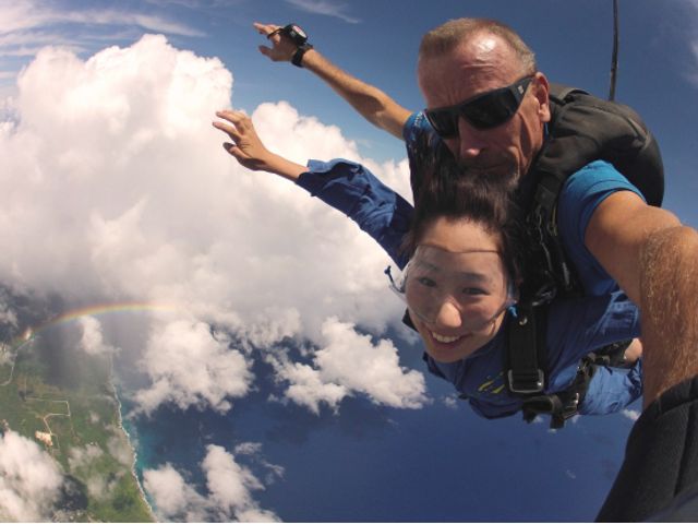 スカイダイビングが初めての方には天候が比較的安定しているサイパンが最適です! 高度2,400mからのフリーフォールの体感速度は時速200km以上!一度経験したら病みつきに。人気のツアーなので事前予約がおすすめ!