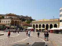 ギリシャ語で単語の語尾に「アキ」を付けると「小さい」とか「可愛い」といった意味になります。したがって、モナスティラキは「小さい修道院(モナスティリー)」。その名のとおり、広場には小さな修道院があり、それと対峙するようにモスクが建っています(現在はモスクとしては使用されていない)。オスマン帝国時代はここがアテネの中心でした。