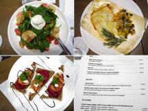 たとえば、画像の「ルッコラのサラダ」に乗っているのは“ツァラフォーティ”と呼ばれる山羊乳100パーセントのクリームチーズ。やや塩味が強いので、これをドレッシング代わりにしていただくと、サラダが一品料理に早変わり。「サーモンのサンドイッチ」はサワーブレッドにビーツのムースを乗せ、その上にスモークサーモンとクリームチーズを合わせています。