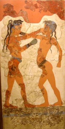 なかでも必見は、最上階に展示されているフレスコ画。紀元前17世紀ごろに噴火したサントリーニ島のアクロティリ遺跡から出土したものですが、当時の絵には宗教色が一切なく、ボクシングに興じる若者や草花を愛でた当時の暮らしが窺えます。