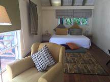 2階建のヒルシャレーの場合、1階にリビングルーム、ミニキッチン、バスルームがあり、2階がベッドルーム。キッチンは冷蔵庫とシンクと湯沸かしポットが用意されているだけのシンプルなものですが、赤ちゃん連れのファミリーなら離乳食の準備などに重宝します。冷蔵庫に入っているコーラなどのソフトドリンクは無料サービス。バスルームは広く、ダブルベイシンの洗面所にバスタブとシャワーブース、休憩用のベンチまでありアメニティも一通り揃っています。2階には広々としたベッドルーム。さらに外には海を見渡せる広いバルコニーがあります。