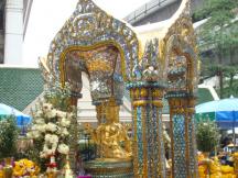 バンコク市内の一大ショッピングエリアのラチャプラソンの十字路にひときわ目立つエラワンの祠。もともとは、隣にある現在のグランドハイアットエラワンホテルの建設を祈願して設立されました。4方向を向いて祀られているプラフマーの神は特に商売、恋愛に対して成就することが高いといわれております。祠の中に(外のお店はぼったくりが多し)線香やろうそくが売っておりますのでお求め頂き願掛け下さい。※予算150円は、ろうそくや線香、お供え代