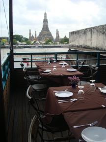 チャオプラヤ川沿いにあるアルンレジデンスというブティックホテル内のレストラン。ここのレストランの名前がザ・デッキレストラン。なんといってもテラス席からは真正面に暁の寺がそびえたっており、圧巻の景色となります。暁の寺の夜のライトアップもきれいですが、明るいうちに正面からチャオプラヤ川の後ろに見える景色は、寺院萌えすること間違いなし。お食事はタイ料理、洋食とも上品なお味です。