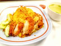 こちらのオススメはSAREFAH HALAL FOOD店のメニュー6番「カオモック・ガイトート」(55バーツ)です。カオモックガイといえばタイでは一般的なB級グルメで、ターメリックやチキンスープと一緒に炊いて黄色くなったご飯の上に、ガイヌム(蒸した鶏)またはガイトート(揚げた鶏)が乗せてあり、乾燥ニンニクが振りかけられています。