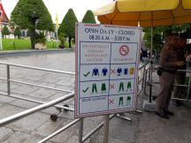 王宮施設に入る前に機械によるセキュリティチェックと服装検査を受けます。短パン、ミニスカート、ノースリーブなど露出の多い場合は入場不可です。洋服の貸し出しが一時期ありましたが、現在はなくなっているため門の外を出た通りの反対側にあるお店で服を買いましょう。長ズボンは100バーツから売ってます。