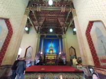 本堂は真上から見ると十字型になるよう建てられています。ご本尊はタイ北部ピサヌローク県のワット・プラ・シー・ラタナー・マハタートにある、タイで一番美しいと言われていている「チンナラート仏像」の複製です。金色の仏像と背景のブルーの壁とのコントラストが美しく、神秘的です。