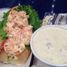クラムチャウダーはあさりがたっぷり入っていて、とろみ加減、塩加減も日本人の口に合います。スモールクラムチャウダーとロブスターロールのセットは$23+taxとレストランで食べるよりはるかに安いです。ロブスターロールは、湯がいたロブスターの身をほぐしてドレッシングで和え、パンに挟んだものですが、さっぱりとした味付けで一度食べたら病みつきになる美味しさです。