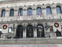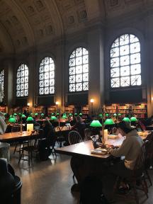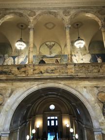 マッキムビルディングのメインエントランスはDartmouth Street(ダートマスストリート)に面していて、3つの重厚な門構えはヨーロッパの美術館を思わせる造り。ここから中に入ると目の前にゴージャスな大理石と柱や階段があり、2階へ上がると、圧倒される壁画の数々、、、、19世紀のフランスを代表する有名な壁画家シャヴァンヌの作品が所狭しと使われています。シャヴァンヌの特徴はフレスコ画の技法を取り入れていることで知られてますが、この大きな壁画はパリのアトリエで完成し、船ではるばる大西洋を渡りボストンに運ばれて来たのです。