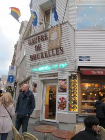 ゴーフル・デゥ・ブリュッセルは、中央駅至近。生粋のベルギー人向けの純粋系のシンプルタイプも、外人向けの今風ゴテゴテデコレーションのものも、ベルギー風もブリュッセル風もなんでもあり。ティールームでは、地元のおばあちゃんおじいちゃんも、見るからに観光客の若い女の子のグループも、隣り合わせで座って楽しんでいるので気軽に入れて庶民的でうれしい。ゴーフル・デゥ・ブリュッセルは、どこかの駅前に必ず一軒ありそうな「大衆食堂」か「喫茶店」の雰囲気だ。
