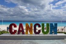 真っ青なカリブ海をバックにカラフルなCANCUNの看板。