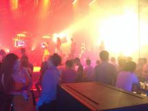 一応DJやVJ(ビジュアルジョッキー)が真ん中のブースにおり、ブースが上に動いたり、スポットライトを当てられたり、スモークがかかったり。演出もバブリー。笑