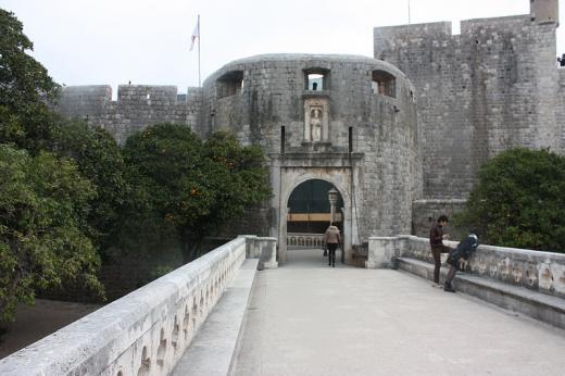 ドブロブニクの空港から、タクシーやバスに乗って約30分ほどの場所にあるのが、旧市街です。この旧市街の西側に立つピレ門は、旧市街の4つの門のうちのひとつで、いつも観光客でにぎわう場所に立っています。門の上部には、市の守護聖人といわれる聖ヴゥラホの小さな白い像があり、目印になっています。